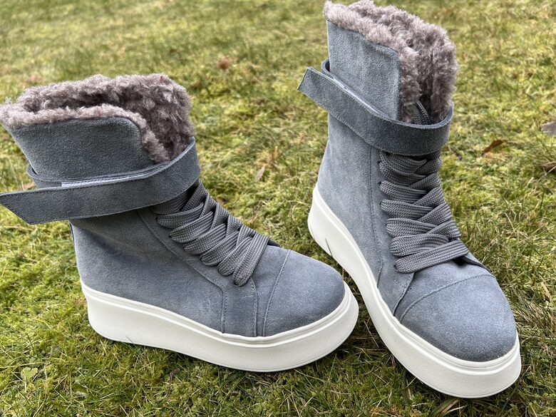Suede ankle boots with insulated lining, lace-up closure and velcro. Can also be worn untied.